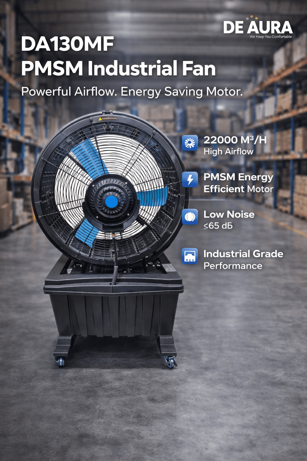 The DA130MF PMSM Industrial Fan is engineered for high-performance air circulation in demanding environments. Powered by advanced Permanent Magnet Synchronous Motor (PMSM) technology, it delivers superior airflow with significantly lower energy consumption.